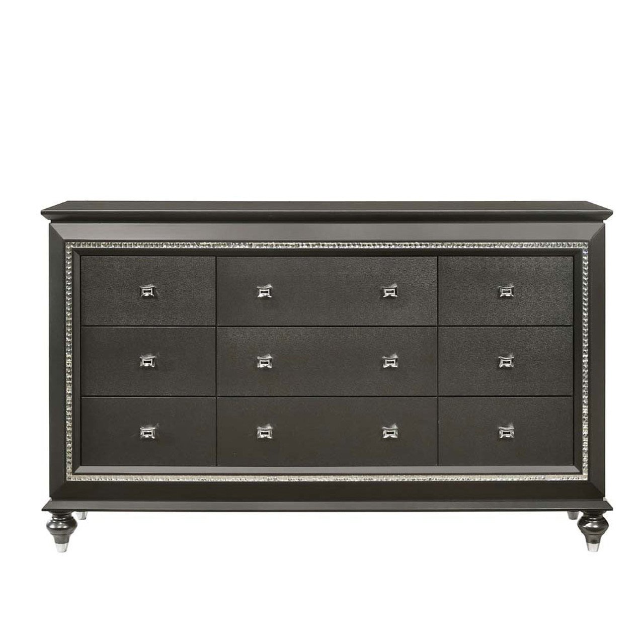 The Kaitlyn dresser provides a commanding presence in any room. Crafted with a transitional look that is an ideal addition to any bedroom, the dresser is accented with textured front and a crystal-like sparkling trim. Its crystal-like trimming creates dazzling glow for your master bedroom. Multiple storage drawers allow you to keep your sleeping area nicely neat.