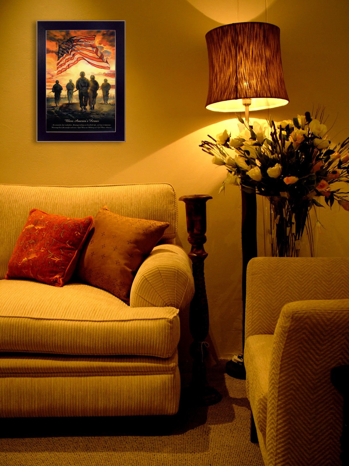 "Bless America's Heroes" is a 10" x 14" framed patriotic print by the exceptional Artist Bonnie Mohr. This artwork features the prominent image of Soldiers on patrol under the American Flag on the top half of the presentation. The bottom portion of the piece presents a patriotic verse honoring our Soldiers. This totally American Made wall decor item features an attractive frame, a textured canvas like finish so no glass is necessary and is ready to hang. •Women Owned (WBE)•Textured Artwork with a 'rolled on' acid free acrylic coating to create a canvas painting effect. No glass is necessary.•UV protectant coating protects artwork from fading.•MDF moulding adds natural beauty to the framed art. Frame is keyholed for ease of hanging.