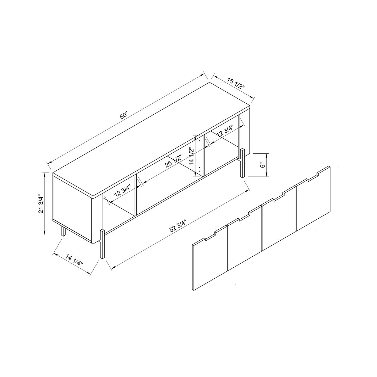Standing tall on sturdy metal legs, this two tone tv stand cabinet features four cabinet doors opening smoothly on metal euro cabinet hinges. Providing three large cabinet spaces with plenty of storage for bulky items, albums, and books, all your clutter can be hidden away behind doors. Streamline metal tube legs and straight cut out handles on doors give a sleek and modern feel to the stand's design.