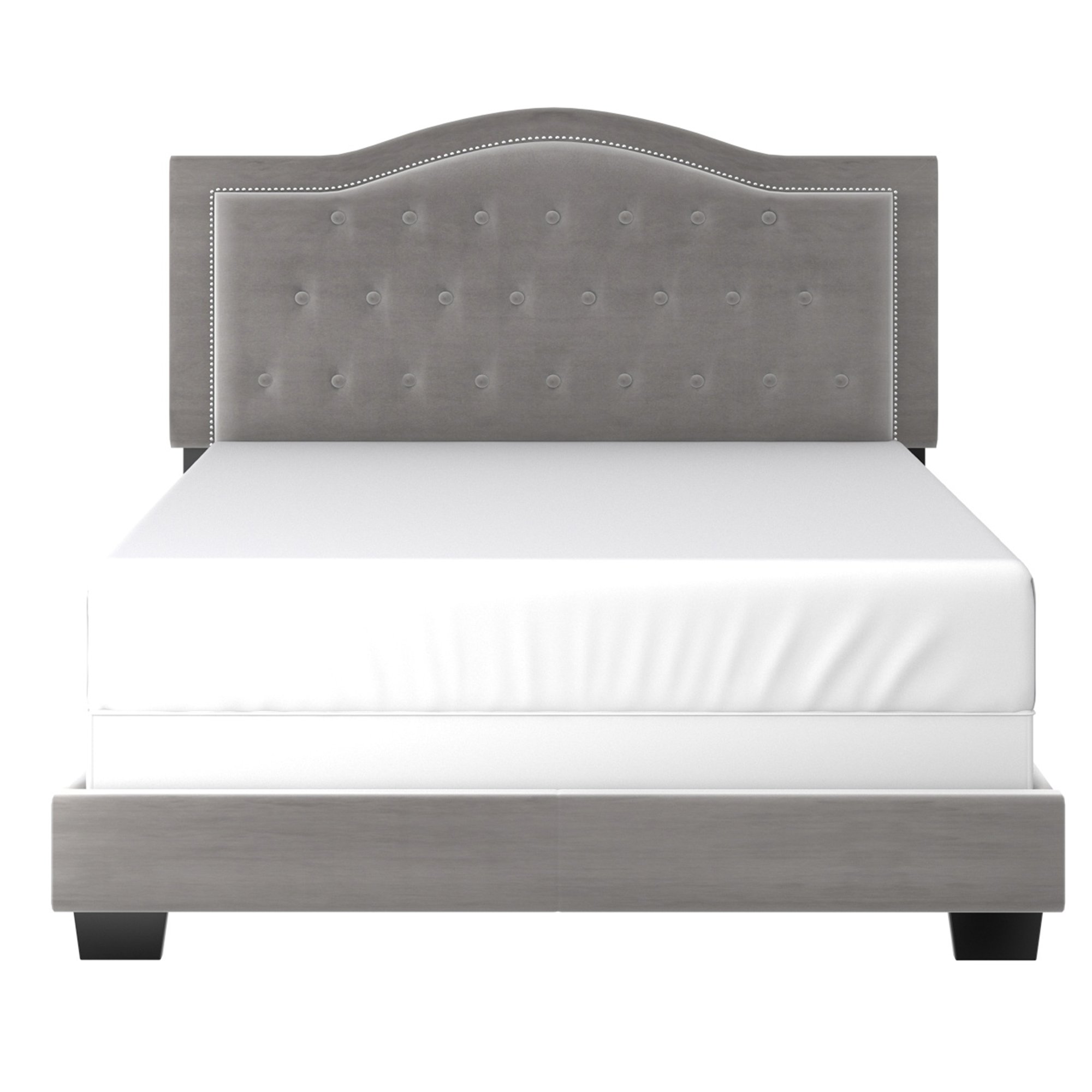 Beautiful and elegant styling on this modern upholstered bed-in-a-box. The sturdy slats and support legs create a solid foundation for your box spring and mattress. Button tufting and nail head detailing on the crown-shaped headboard lend an elegant air of high-end design. A perfect piece for a principle bedroom or child's room.