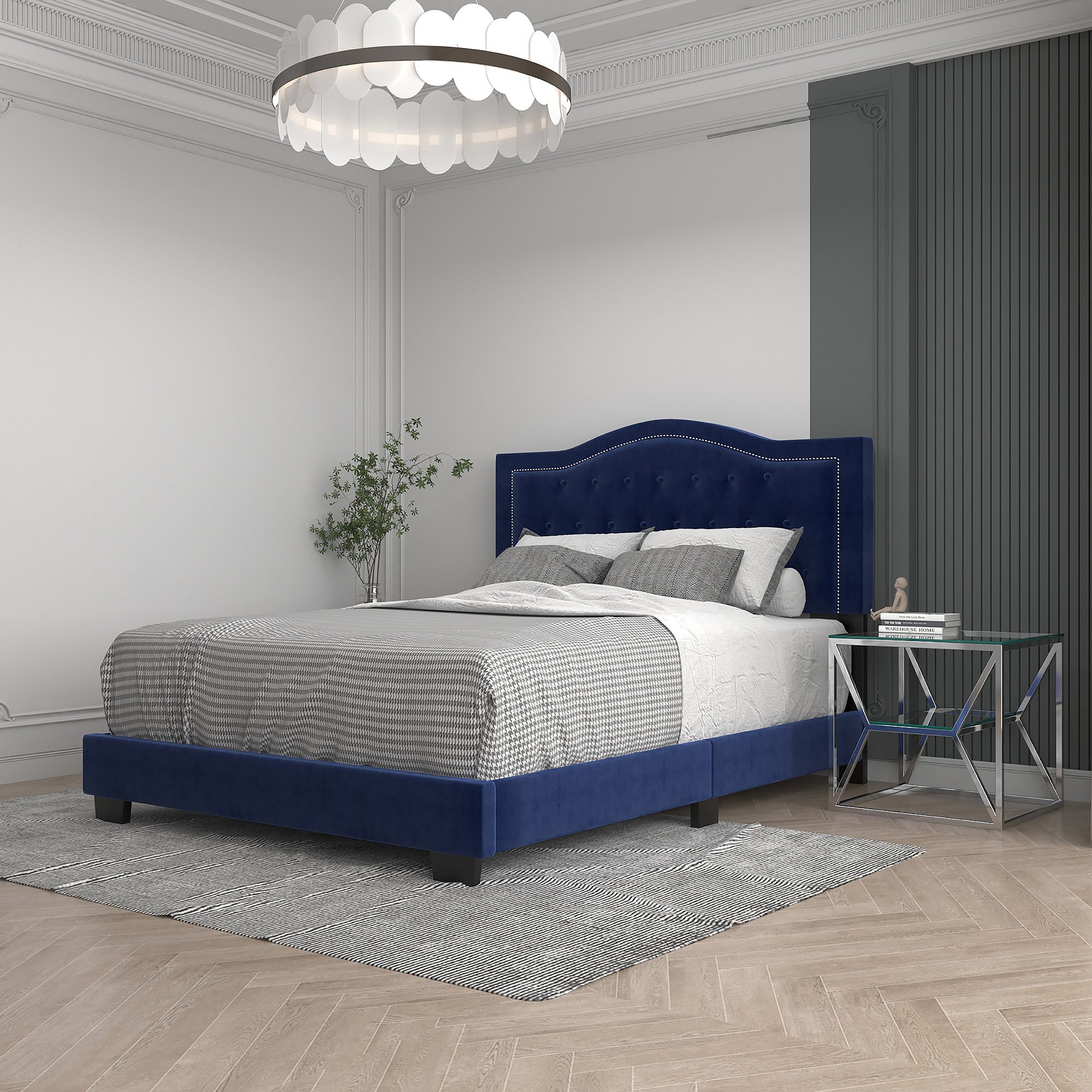 Beautiful and elegant styling on this modern upholstered bed-in-a-box. The sturdy slats and support legs create a solid foundation for your box spring and mattress. Button tufting and nail head detailing on the crown-shaped headboard lend an elegant air of high-end design. A perfect piece for a principle bedroom or child's room.
