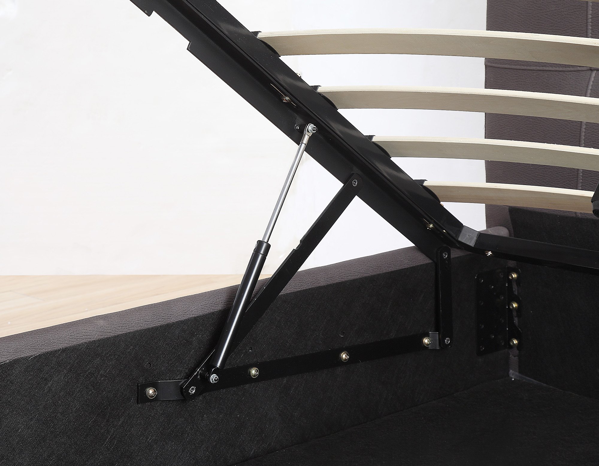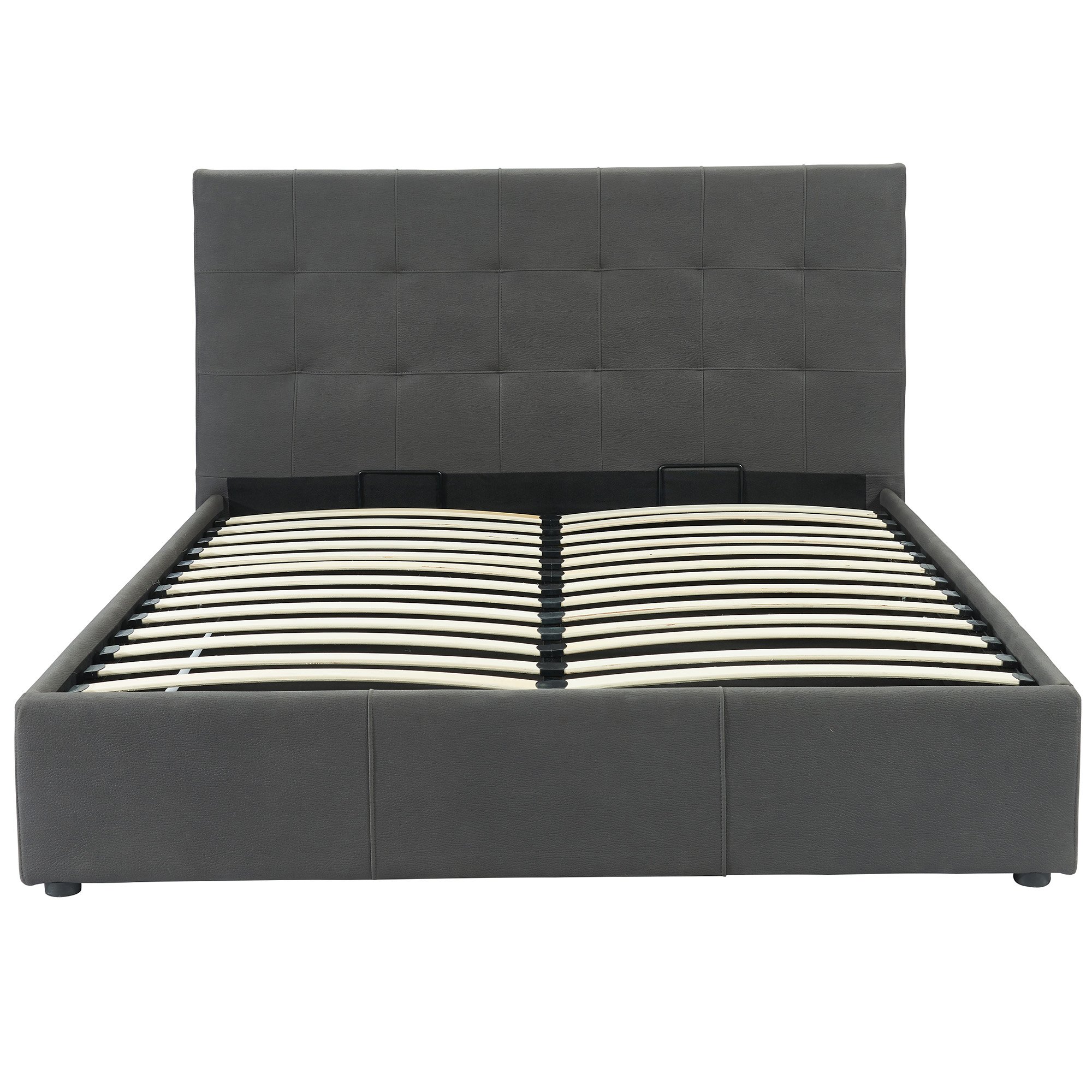 Bring seamless class, and more space to your bedroom with this 60" platform storage bed. Durably constructed with premium quality square tufted headboard with stitching detail and fully upholstered in textured, faux nubuck. This upholstered bed boasts a sturdy and reliable 26 pcs slat system with 2 support legs ensuring no need for box spring. The easy-lift hydraulic system offers plenty of storage space ideal for seasonal clothes, bed linens, and much more.