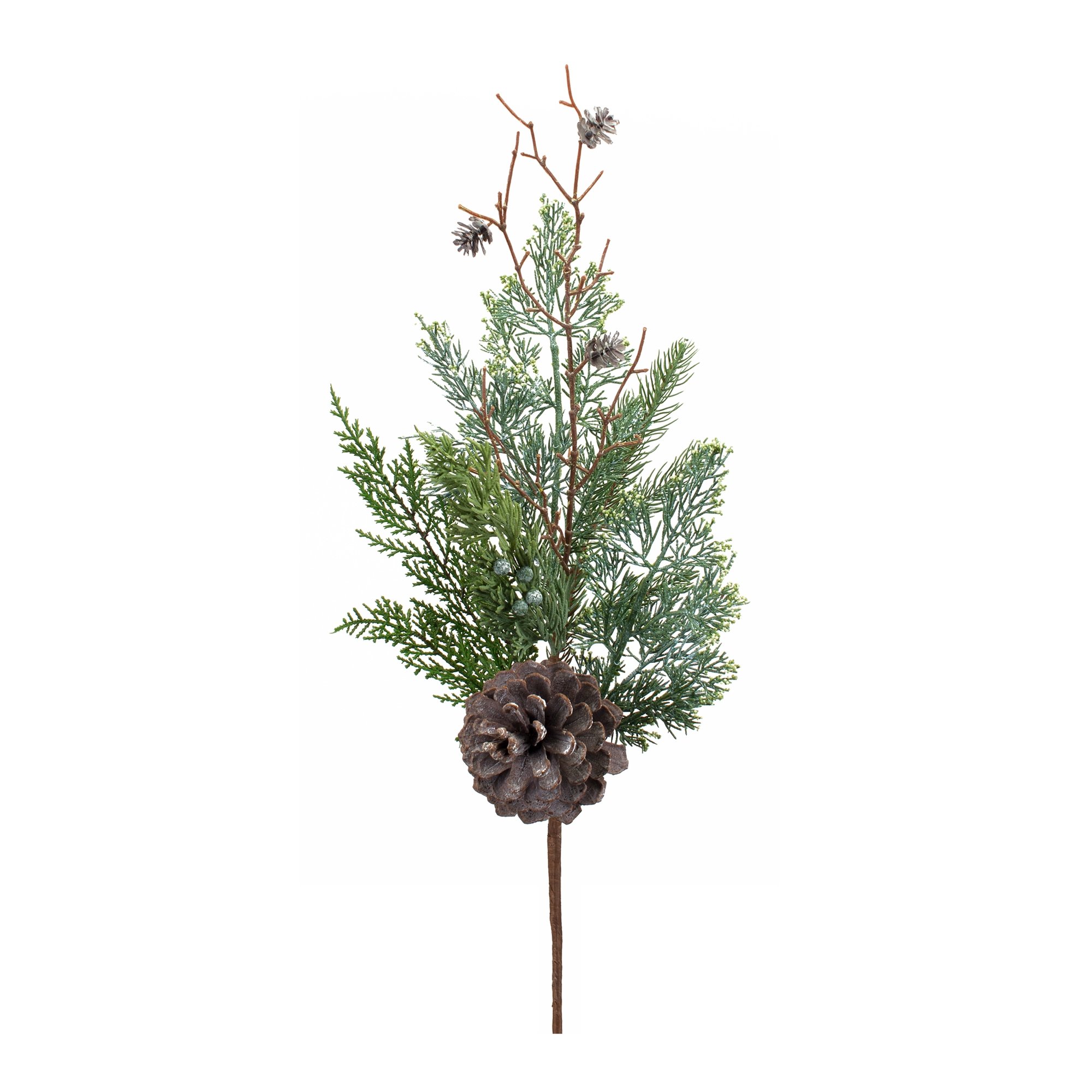 Ring in the holiday season with this beautiful set of Juniper and Pine Sprays. Featuring six pieces, this set would be a great addition to your Christmas centerpiece or table arrangement. The varigated juniper and pine foliage paired with the pinecone and twig accents is the perfect combination to create a stunning Christmas display. Add this set to a table vase to make a statement.